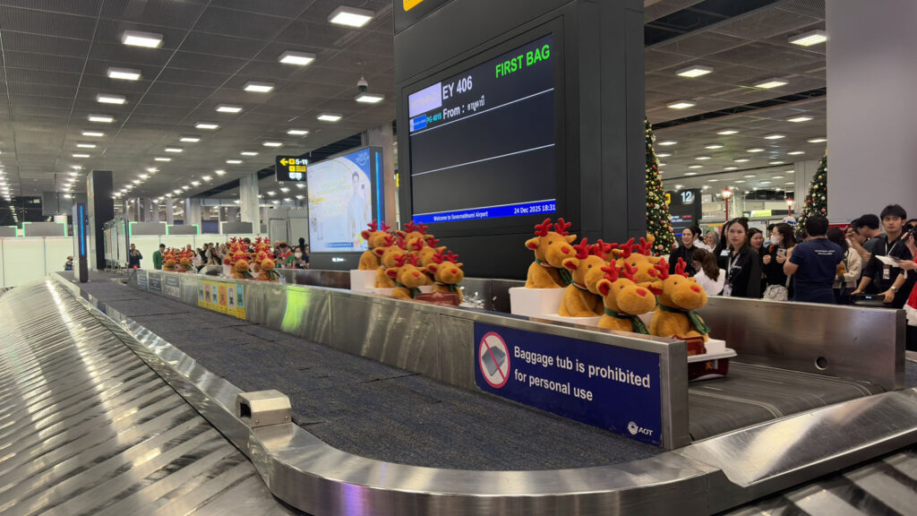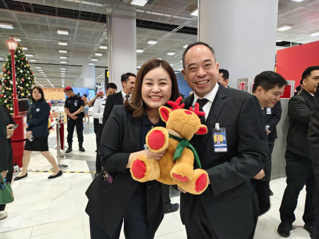 วันนี้ (24 ธันวาคม 2568) เวลา 17.00 น. นางสาวปวีณา จริยฐิติพงศ์ รักษาการผู้อำนวยการใหญ่ บริษัท ท่าอากาศยานไทย จำกัด (มหาชน) และ นายกิตติพงศ์ กิตติขจร ผู้อำนวยการท่าอากาศยานสุวรรณภูมิ พร้อมด้วยคณะผู้บริหาร ทสภ. ร่วมมอบ Travel Kit ให้แก่ผู้โดยสารขาออก ณ โถงผู้โดยสารขาออก ชั้น 4 ต่อมาเวลา 18.00 น. คณะผู้บริหาร ทสภ. ได้มอบของขวัญสุดเซอร์ไพรส์เนื่องในวันคริสต์มาสอีฟ เป็นตุ๊กตากวางเรนเดียร์ตัวใหญ่ลำเลียงผ่านสายพานรับกระเป๋า ส่งตรงถึงมือผู้โดยสารสายการบิน Etihad Airways เที่ยวบิน EY406 จากกรุงอาบูดาบี สหรัฐอาหรับเอมิเรตส์ และสายการบิน Jetstar Airways เที่ยวบิน JQ029 จากเมืองเมลเบิร์น ประเทศออสเตรเลีย ณ สายพานรับกระเป๋าหมายเลข 11–12 โถงผู้โดยสารขาเข้า ชั้น 2 สร้างรอยยิ้ม ความสุขและความประทับใจแก่ผู้โดยสารเป็นอย่างมาก