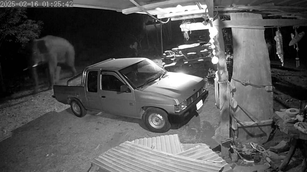 วันที่ 3 เมย.69 กล้องวงจรปิดจับภาพช้างป่าจากเขตอนุรักษ์สัตว์ป่าและพันธุ์พืชเขาอ่างฤาไนจังหวัดฉะเชิงเทรามาบ้านอดีตผู้ช่วยผู้ใหญ่บ้านหมู่ที่ 11 ต.เขาไม้แก้ว อ.กบินทร์บุรี จ.ปราจีนบุรี กลางดึกคืนวันที่ 2 เมย.ที่ผ่านมาขณะที่เจ้าตัวพร้อมภรรยาและลูกนอนหลับอยู่ภายในบ้านเลขที่130/4หมู่ 11บ้านคลองยาง ต.เขาไม้แก้ว อ.กบินทร์บุรี จ.ปราจีนบุรี ผู้สื่อข่าวได้เดินทางไปยังบ้านเลขที่หลังดังกล่าว ได้พบกับนายอุดมศักดิ์ เฉลิมศรี อายุ 48 ปี ได้ฮาเดินสำรวจดูบริเวณหลังบ้านพบว่า มีรอยช้างดึงใบกล้วยกิน 3-4 ใบ จากนั้นช้างป่าตัวดังกล่าวได้เดินมายังบริเวณหน้าบ้านปูนชั้นเดียว ซึ่งบริเวณหน้าบ้านมีกล้องวงจรปิดจับภาพช้างป่าตัวใหญ่มีงานเดินมาใช้งวงส่ายไปมาแล้วก็เดินจากไปทางหน้าบ้าน