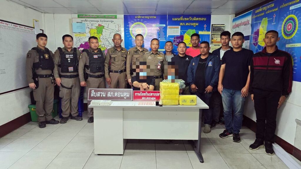 เมื่อวันที่ 11 ธันวาคม 2568 พ.ต.อ.ยงลิต ศุภผล ผกก.สภ.ดอนตูม พร้อมกำลังเจ้าหน้าที่ตำรวจ สภ.ดอนตูม ได้ร่วมกันจับกุมตัวผู้ต้องหาคดีจำหน่ายยาเสพติดจำนวน 2 คือ นายชินวุฒิ หรือ ฟลุ๊ค อินทเสน อายุ 44 ปี อยู่บ้านเลขที่ 90 ม.7 ต.หนองงูเหลือม อ.เมืองนครปฐม จว.นครปฐม และ นางสาวแก้วตา หรือ ต่าย ชื่นใจดี อายุ 30 ปีอยู่บ้านเลขที่ 128/2 ม.13 ต.หนองขาว อ.ท่าม่วง จว.กาญจนบุรี พร้อมของกลาง ยาบ้าจำนวน 95,400 เม็ด โทรศัพท์มือถือจำนวน 2 เครื่อง พร้อมตรวจยึดทรัพย์สินที่เกี่ยวกับยาเสพติดตามพรบ.มาตรการฯ รถยนต์เก๋ง ยี่ห้อ โตโยต้า สีขาว หมายเลขทะเบียน 5 ขถ 5936 กรุงเทพมหานคร