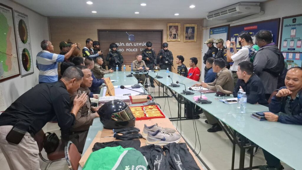 เอราวัญ 1 สอบปากคำโจรด้วยตัวเองหลังถูกจับได้จากการปล้นร้านทองย่านบางบ่อก่อนหลบหนีทางเรือเมื่อเวลา 15.00 น. วันที่ 20 สิงหาคม 2568 ที่สถานีตำรวจภูธรบางบ่อ จังหวัดสมุทรปราการ พล.ต.ท.สุรพล เปรมบุตร ผู้บัญชาการตำรวจภูธร ภาค 1 พร้อมด้วย พล.ต.ต. นราเดช ทิพย์รักษ์ รองผู้บัญชาการตำรวจภูธร ภาค 1 พล.ต.ต. วรชาติ แสนดำ
